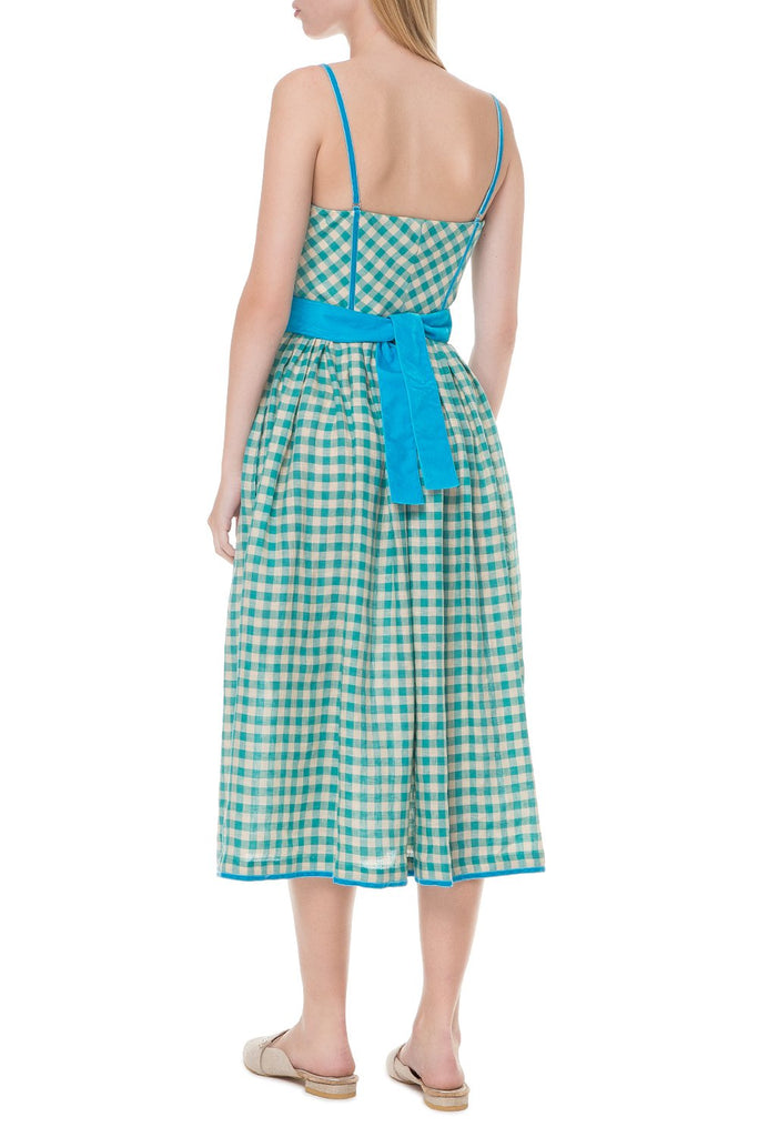 Checked dress by Lee Pfayfer is cut in a loose shape from light and airy linen fabric with velvet trim. Dress with corset bodice detail and thin straps. Wear with sandals and a basket bag while sightseeing on vacation.